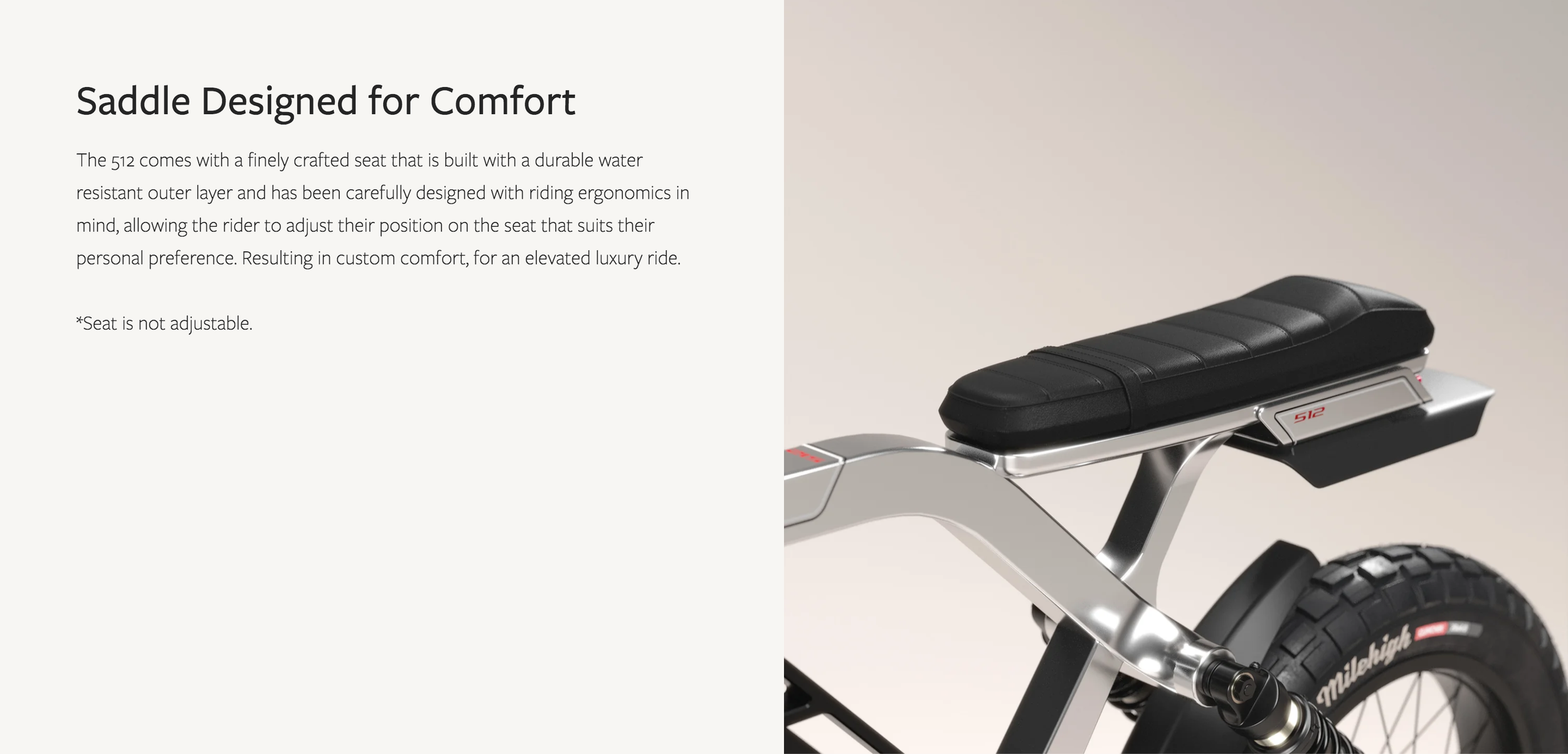 Cutting-edge world-class frame, quality craftsmanship, beautiful design and feature-rich, optimizing for longer distances and higher speeds. The 512 model is a street-legal electric bike that does not require a license, insurance or registration.